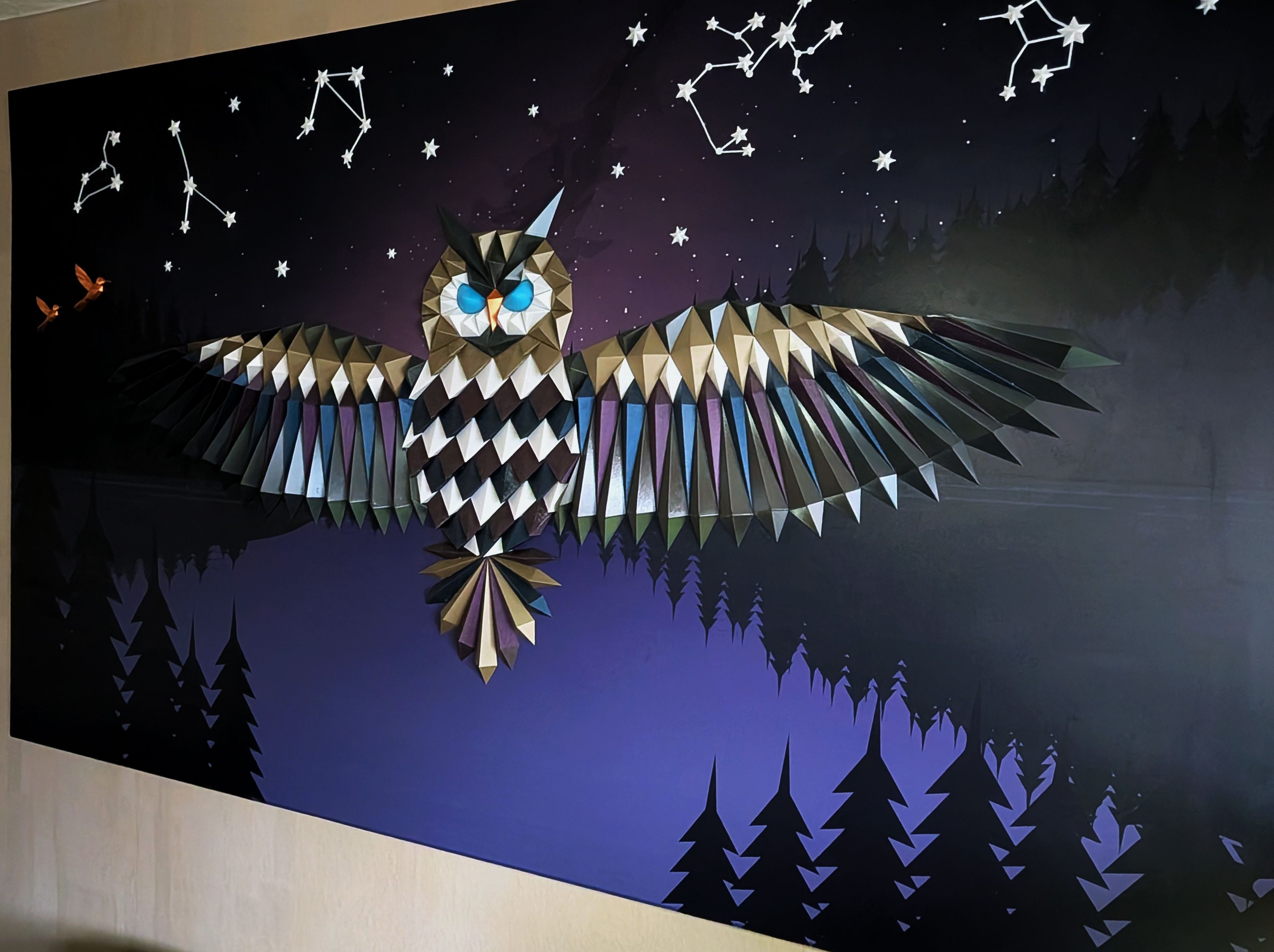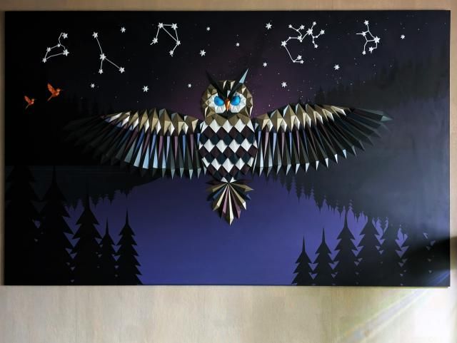 This polygonal owl, looking like a secret keeper, embodies wisdom and mystery. Its large, piercing eyes seem to peer into infinity, while its geometric feathers create a captivating play of light and shadow. A work of art that will bring a touch of magic to your interior.